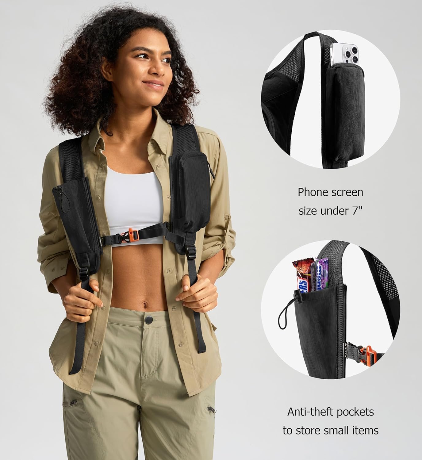 QUALITY ACCESSORIES: Made of thickened water-resistant nylon material and high-quality SBS zipper. Durable and not easy to tear. The fabric is water resistant and quick drying, supporting the outdoor’s basic needs. There is an adjustable chest strap to stabilize two shoulder straps that have a survival whistle and sunglasses holder.