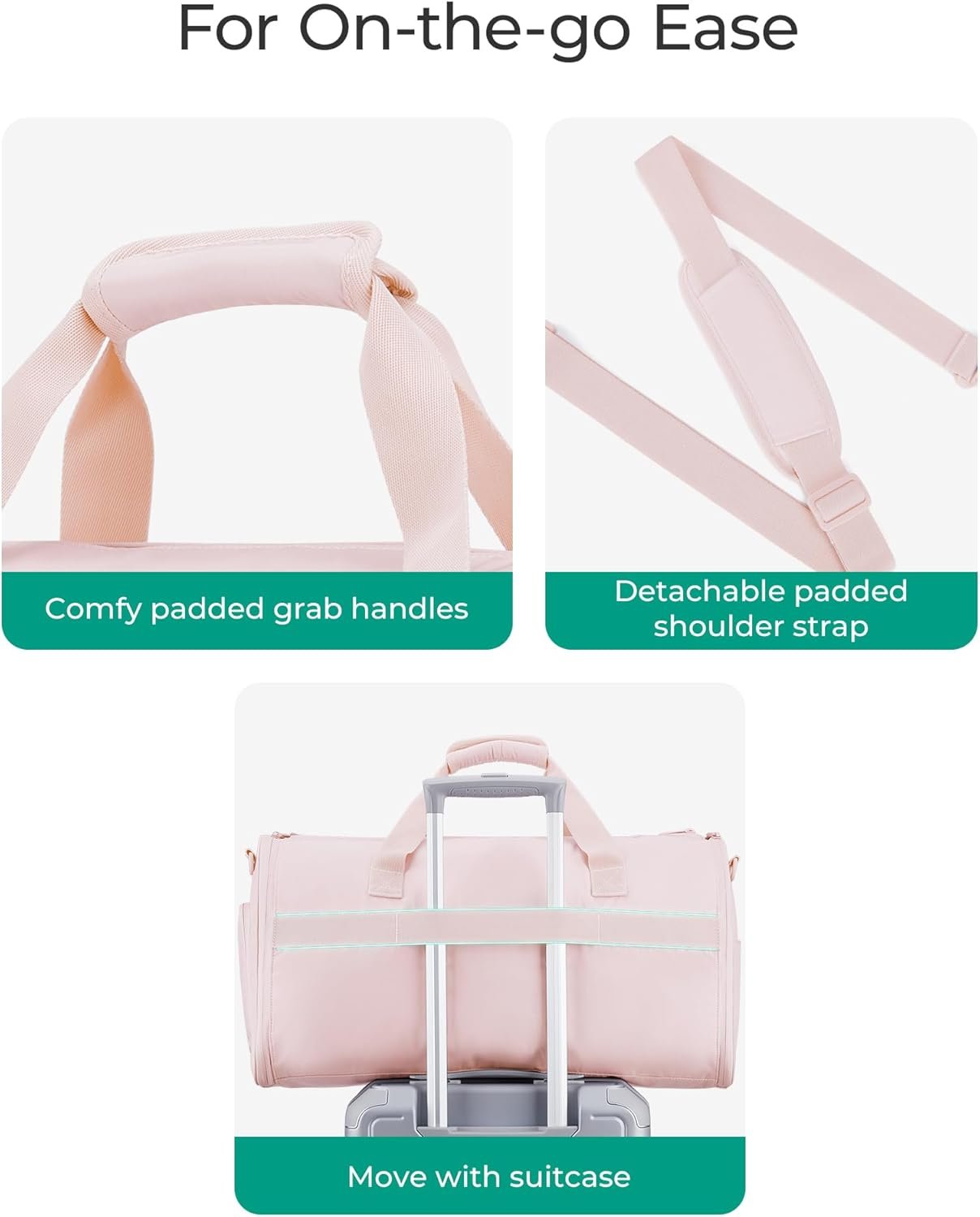 Multiple Carrying Options: The carry on garment bag is equipped with adjustable and detachable shoulder straps, and the stress points have added padding to minimize pressure on your shoulders, thereby reducing pain and discomfort from prolonged use. This garment duffel bag supports three carrying styles: shoulder, handheld, and crossbody, or attach the luggage bag to your luggage with the luggage strap for easy transport