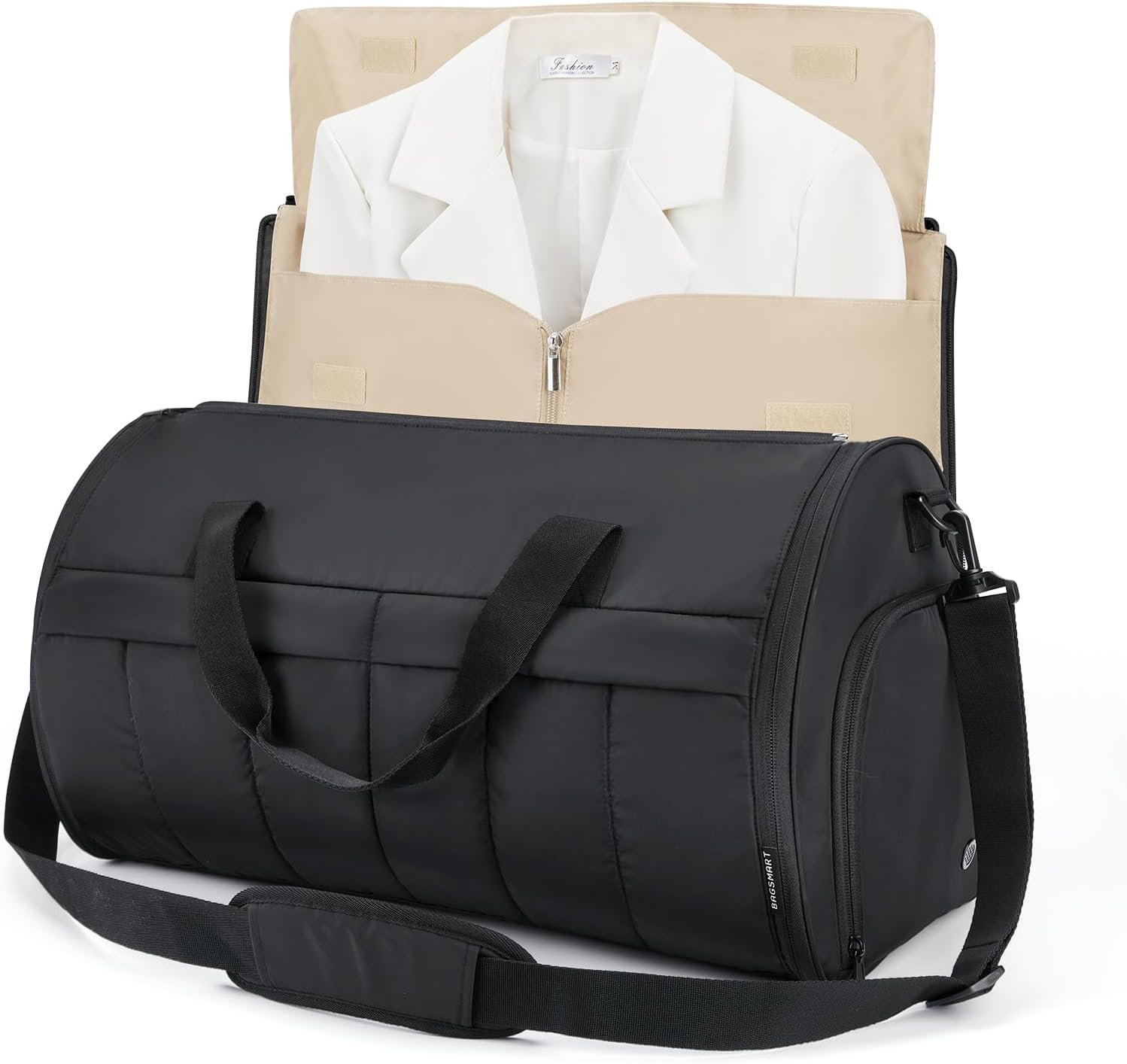 2-in-1 Garment Duffle Bag: This is an innovative travel bag designed to function both as a garment bag and a duffle bag. It not only keeps your suit neat and wrinkle-free during formal occasions such as business trips, weddings, and performances, but can also transform into a travel duffle bag for vacations, weekend getaways, and personal carry-ons