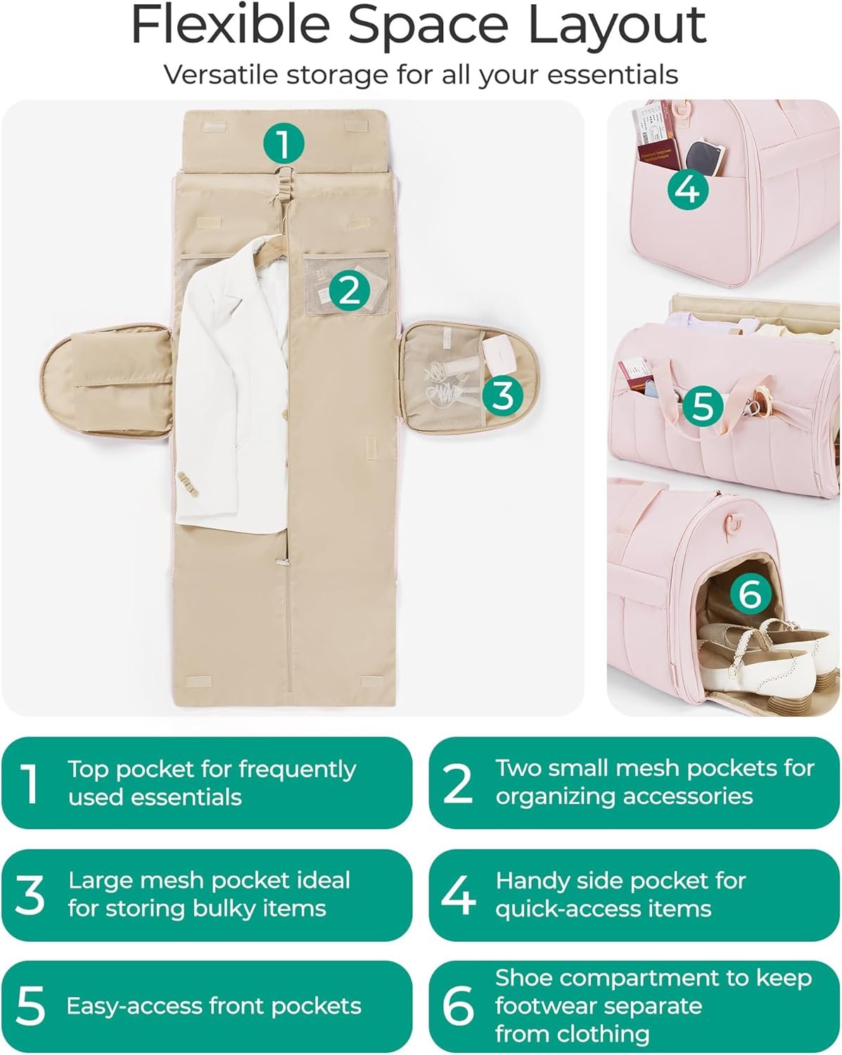 Multiple Compartments: The convertible garment bag for travel comes equipped with 1 top pocket for frequently used essentials, 2 small mesh pockets for organizing accessories, 1 shoe compartment to keep footwear separate from clothing, 1 large mesh pocket ideal for storing bulky items and 1 handy side pocket for quick-access items. This foldable garment bag optimizes storage space and helps you stay organized on the go
