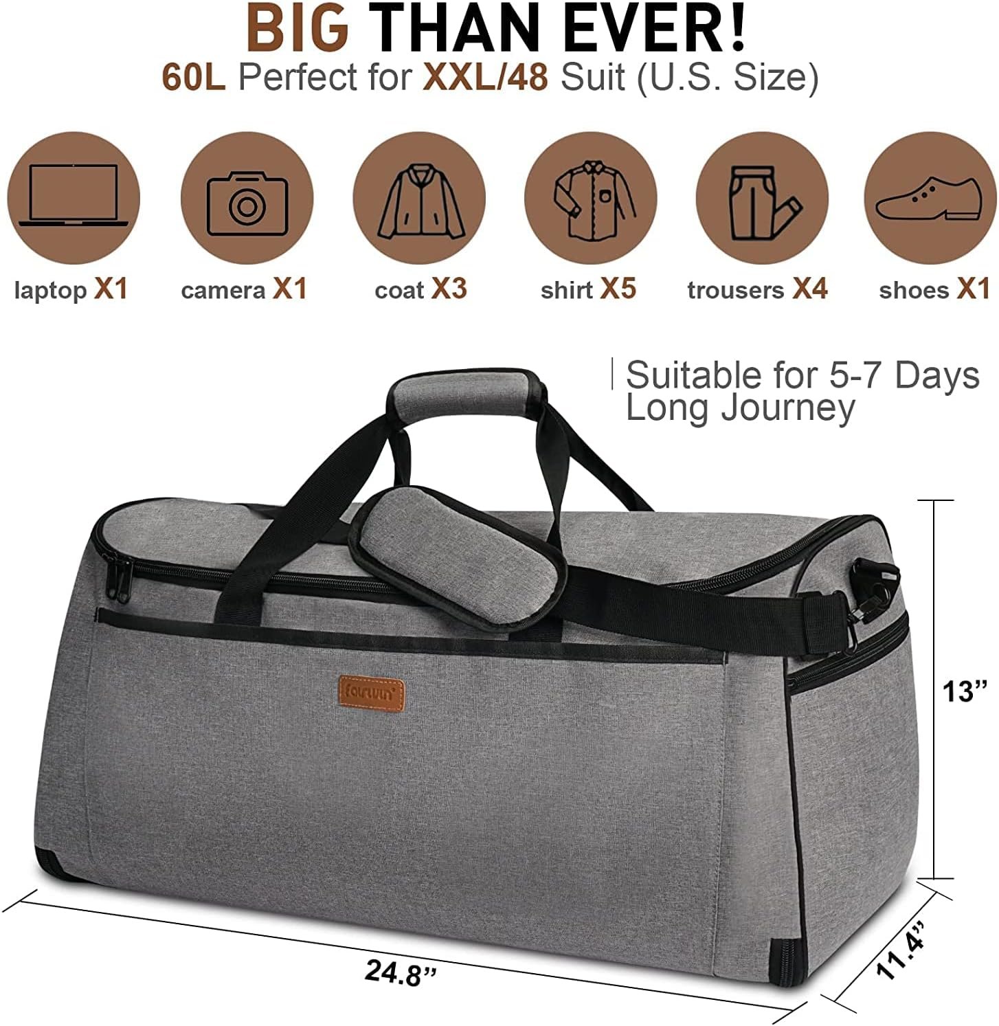 ▶Upgrade Oversized 60L Capacity Garment Duffle Bag to Meet Your General Travel Need. Fairwin upgrade carry on garment bag can meet the shoulder width up to size 52 or XXL+ suits. And you can pack everything you need to travel and business trip. For example, suits, tuxedos, trench coats, shoes, towels, toothbrushes, laptops, power banks, and so on. Large-capacity suit bags are an indispensable part for men travel.