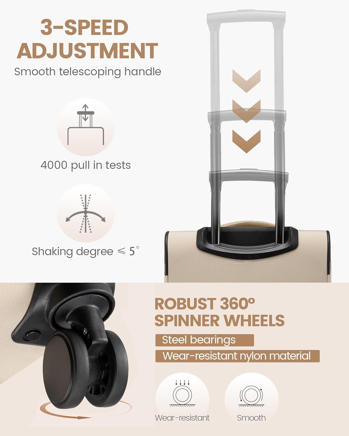 ăTSA-Approved Security & Easy RollingăThis travel luggage is equipped with a TSA-approved lock for extra security and robust double spinner wheels that offer quiet, effortless rolling on various surfaces. Enjoy the perfect blend of security and convenience with this design.