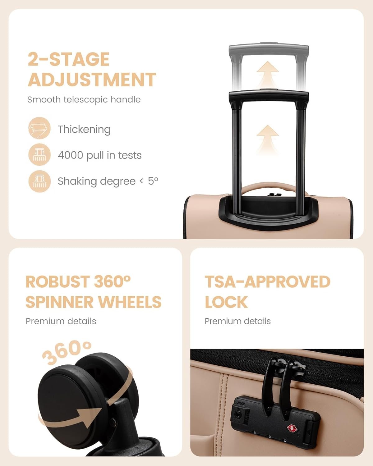 【360° Silent Spinner Wheels & TSA Lock】 Four 360° silent double-spinner wheels glide smoothly across uneven surfaces. TSA-accepted combination lock provides security while allowing hassle-free customs inspections during international travel.