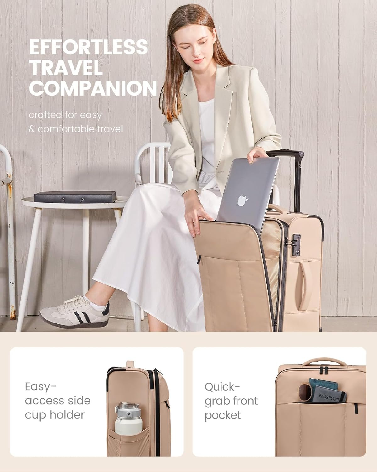 【Lightweight & Protective Softshell Design】 This suitcase perfectly blends convenience and durability, crafted from high-density, lightweight nylon fabric and featuring a front panel cushioned with soft padded cotton to ensure both a feather-light feel and robust protection. Its stain-resistant and waterproof finish handles travel smudges with ease. Plus, with a convenient front pocket and side water bottle holder, organizing all your travel essentials has never been easier.
