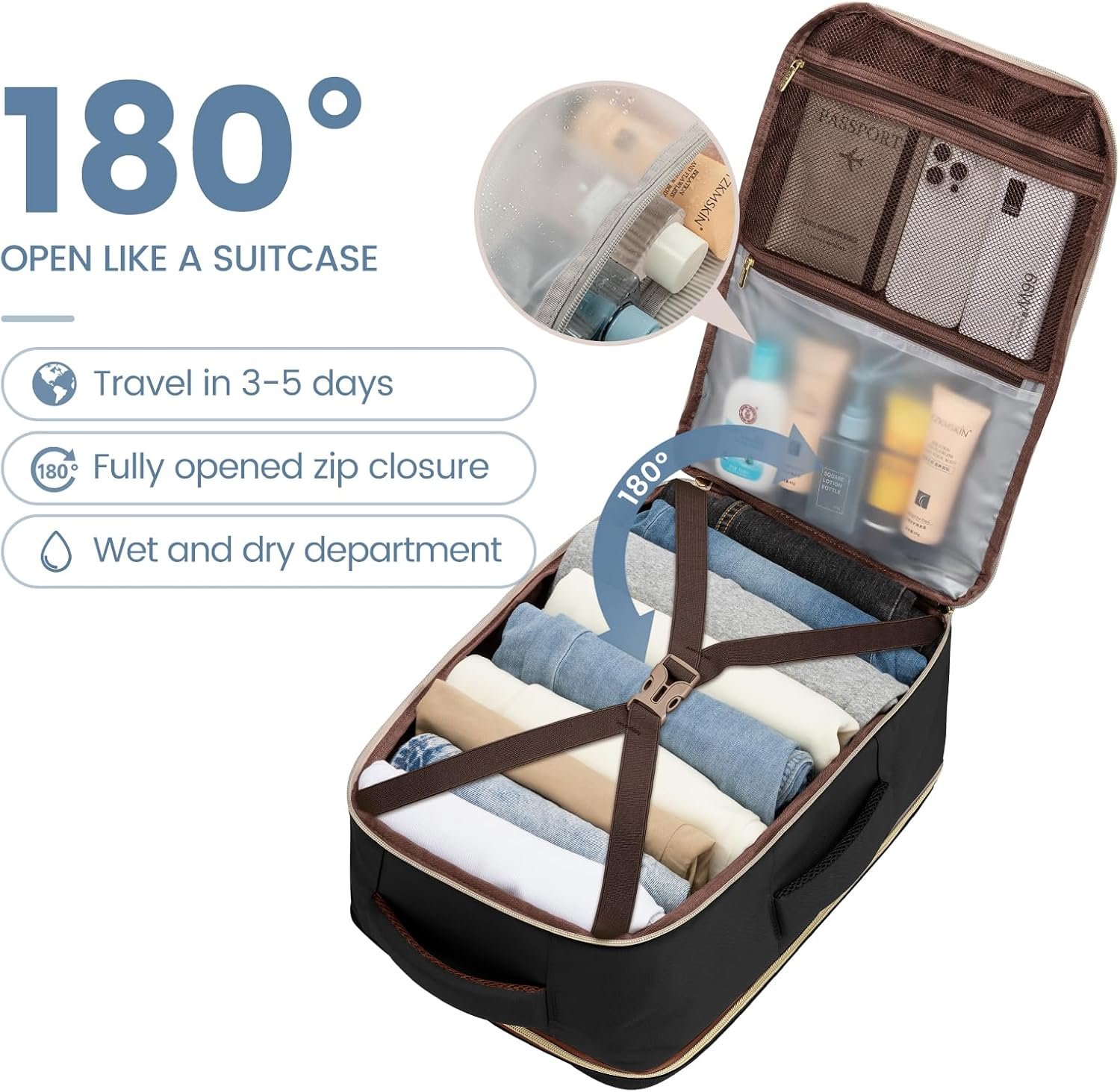 Packing Cubes & Wet Pockets & Shoe Bag : This travel backpack comes with 3 additional storage pockets, a toiletry bag and a shoe bag and a clothing organizer bag. This ensures your products are clean and tidy.