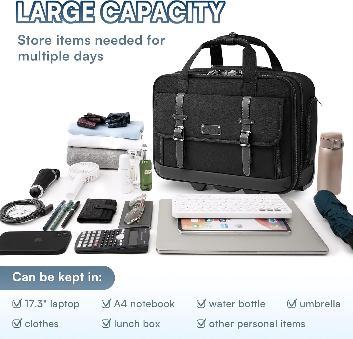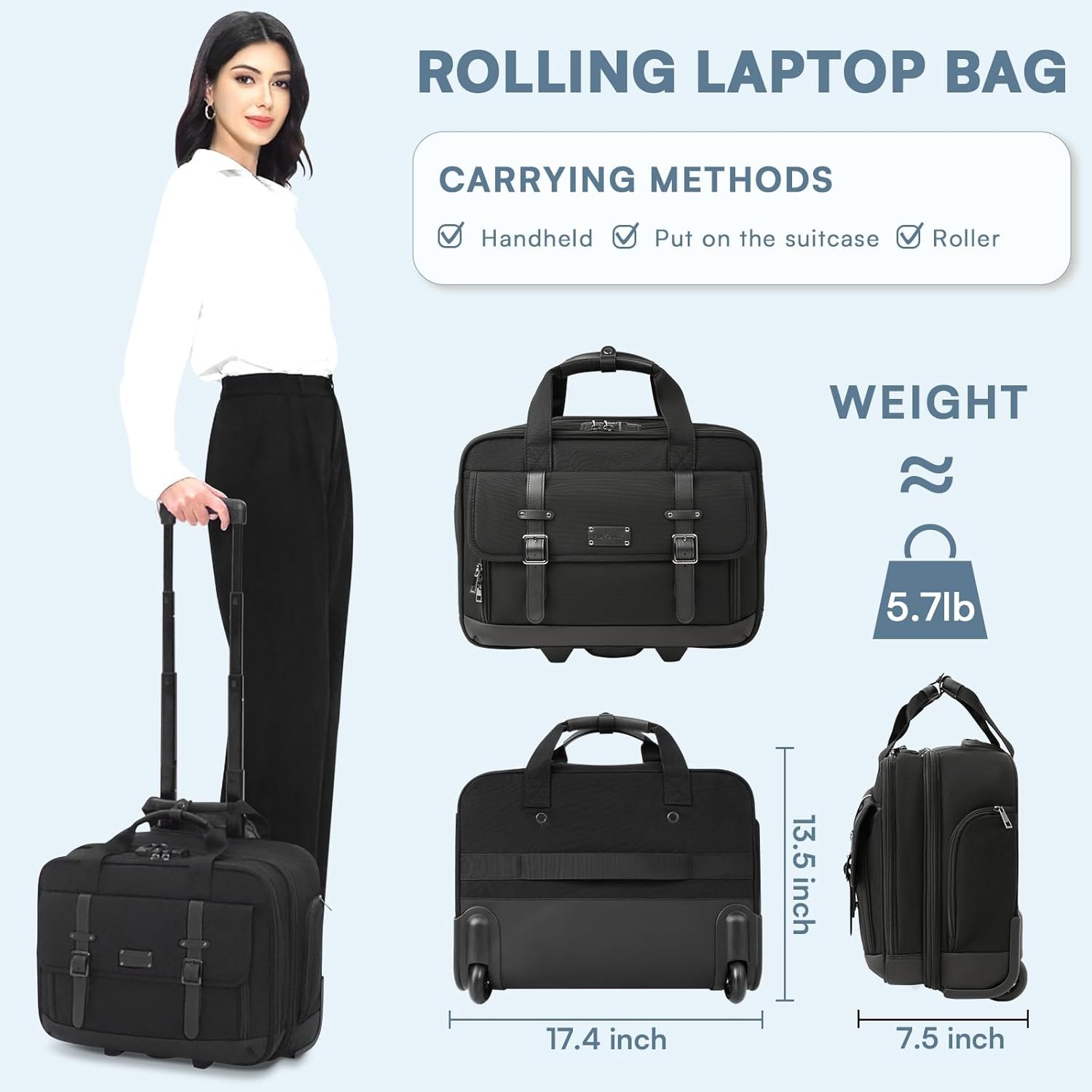 Rolling Laptop Bag, Briefcase for Men and Women, 17 Inch Computer Bag with Wheels Underseat Carry on Luggage, Laptop Briefcase Case for Work, Travel, College Teacher, Mobile Office Bag, Black